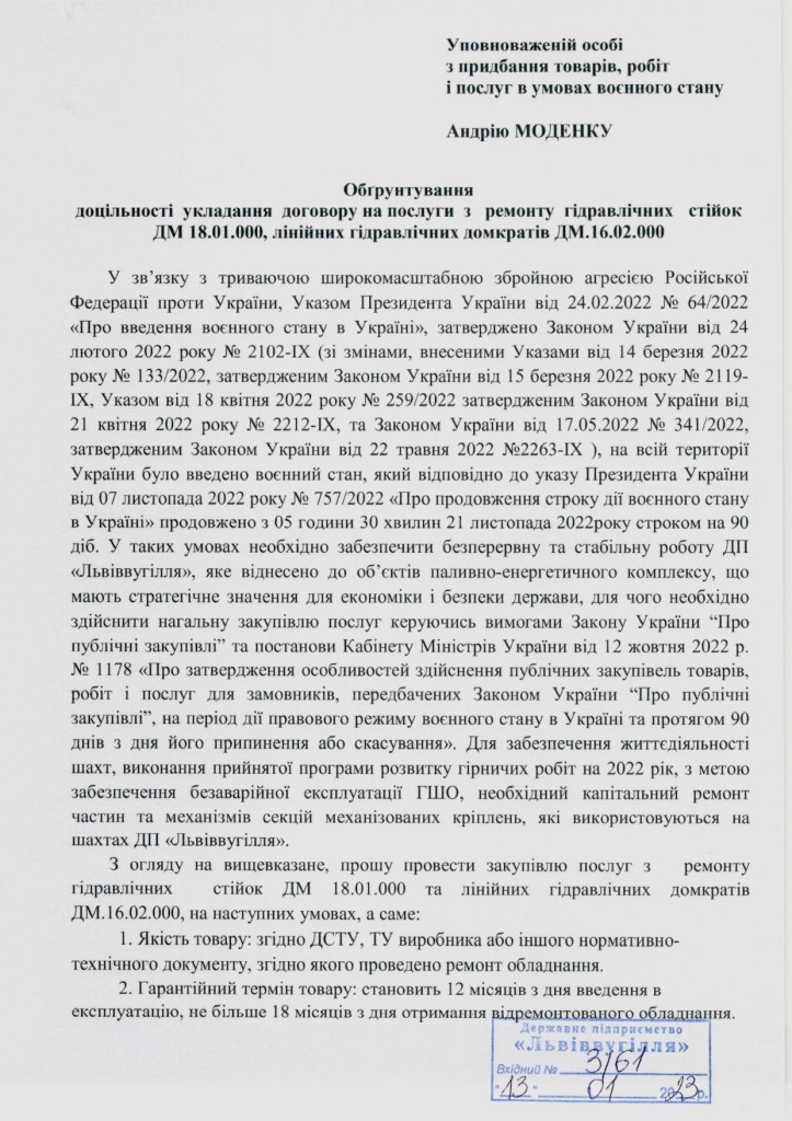 ДП «Львіввугілля» оголосило конкурентної процедуру закупівлі.
