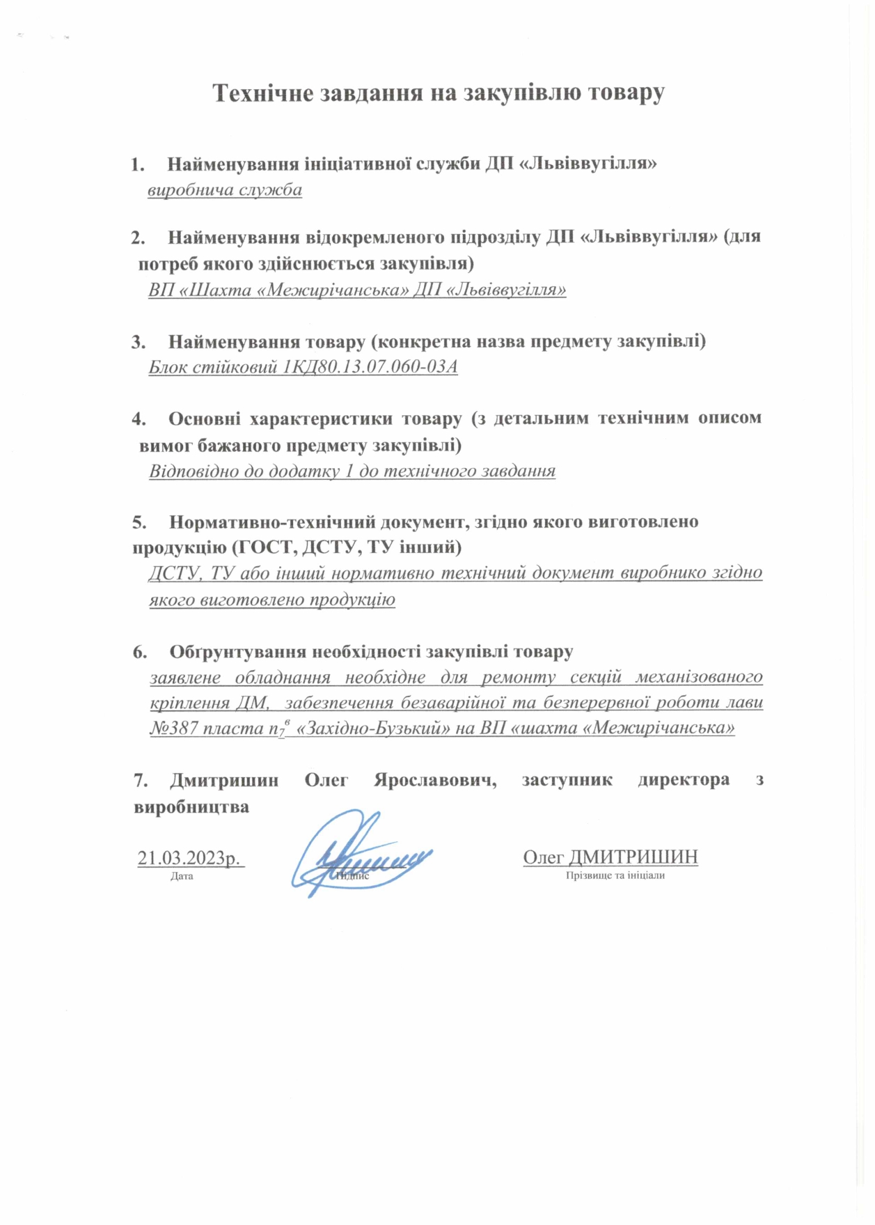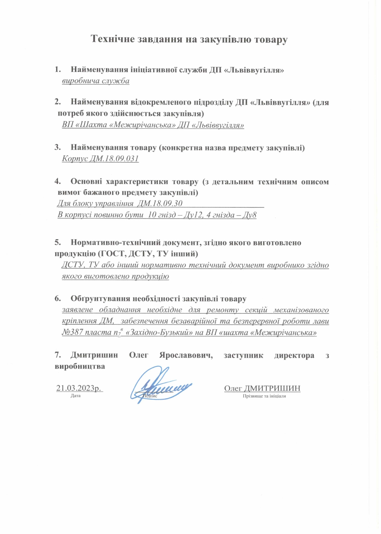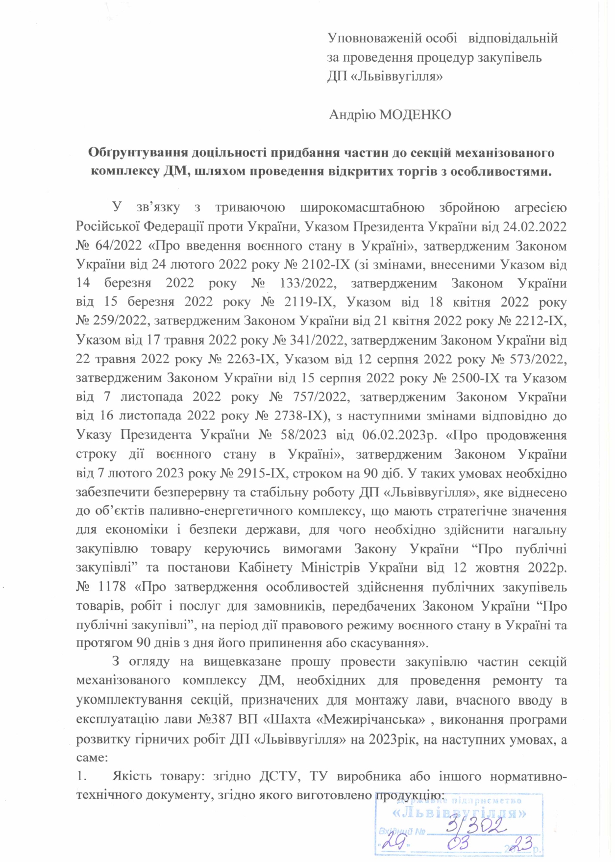 ОГОЛОШЕНО ПРОЦЕДУРУ КОНКУРЕНТНОЇ ЗАКУПІВЛІ Опубліковано 04.04.2023 Відповідно до постанови Кабінету Міністрів України від 16 грудня 2020 р. №1266 повідомляємо: ДП «Львіввугілля» оголосило конкурентної процедуру закупівлі. ЧАСТИНИ СЕКЦІЙ МЕХАНІЗОВАНОГО КОМПЛЕКСУ ДМ Ідентифікатор закупівлі: UA-2023-04-04-011942-a Очікувана вартість: 1 957 080,00 UAH з ПДВ
