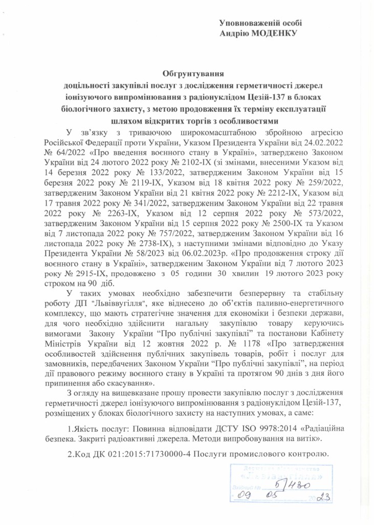 Очікувана вартість:           193 384,80 UAH з ПДВОбгрунтування - Дослідження герметичності джерел іонізуючого випромінювання з метою подовження їх терміну експлуатації_page-0001Обгрунтування - Дослідження герметичності джерел іонізуючого випромінювання з метою подовження їх терміну експлуатації_page-0002Технічне -завдання дослідження_page-0001