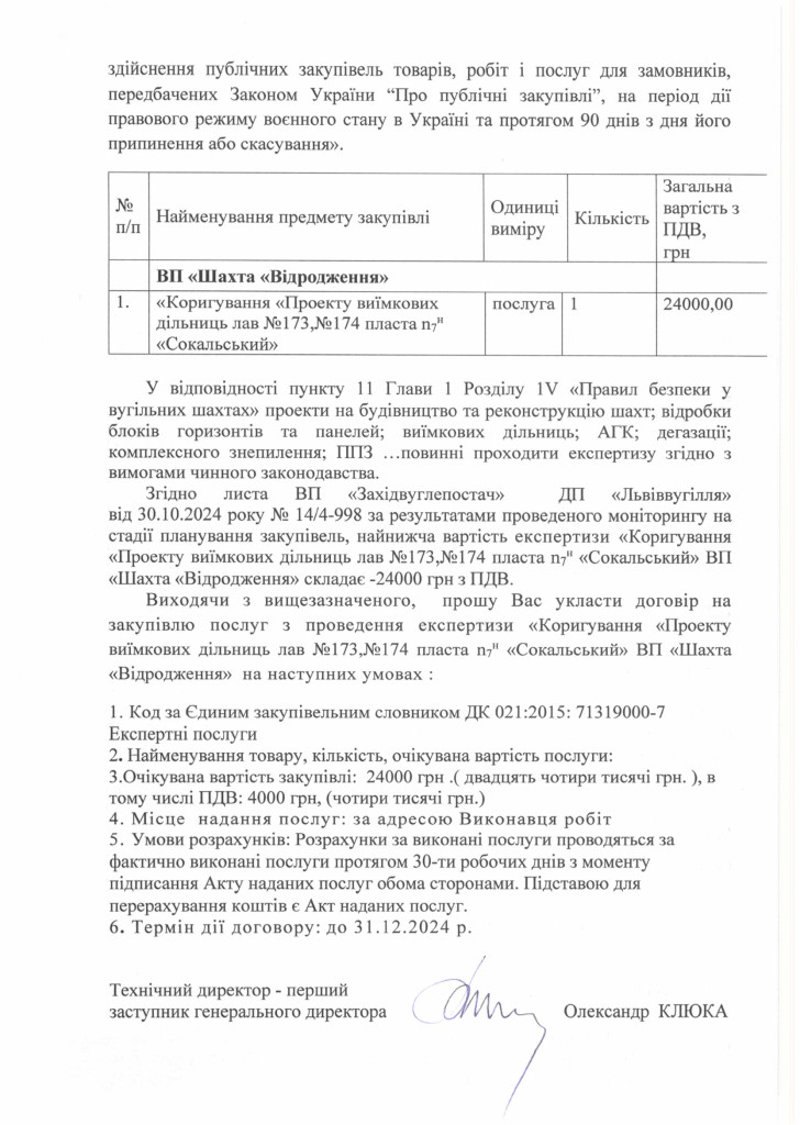 ПОСЛУГИ З ЕКСПЕРТИЗИ ПРОЕКТІВ ВИЇМКОВИХ ДІЛЬНИЦЬ ЛАВ № 173, № 174 ПЛАСТА N7Н «СОКАЛЬСЬКИЙ»