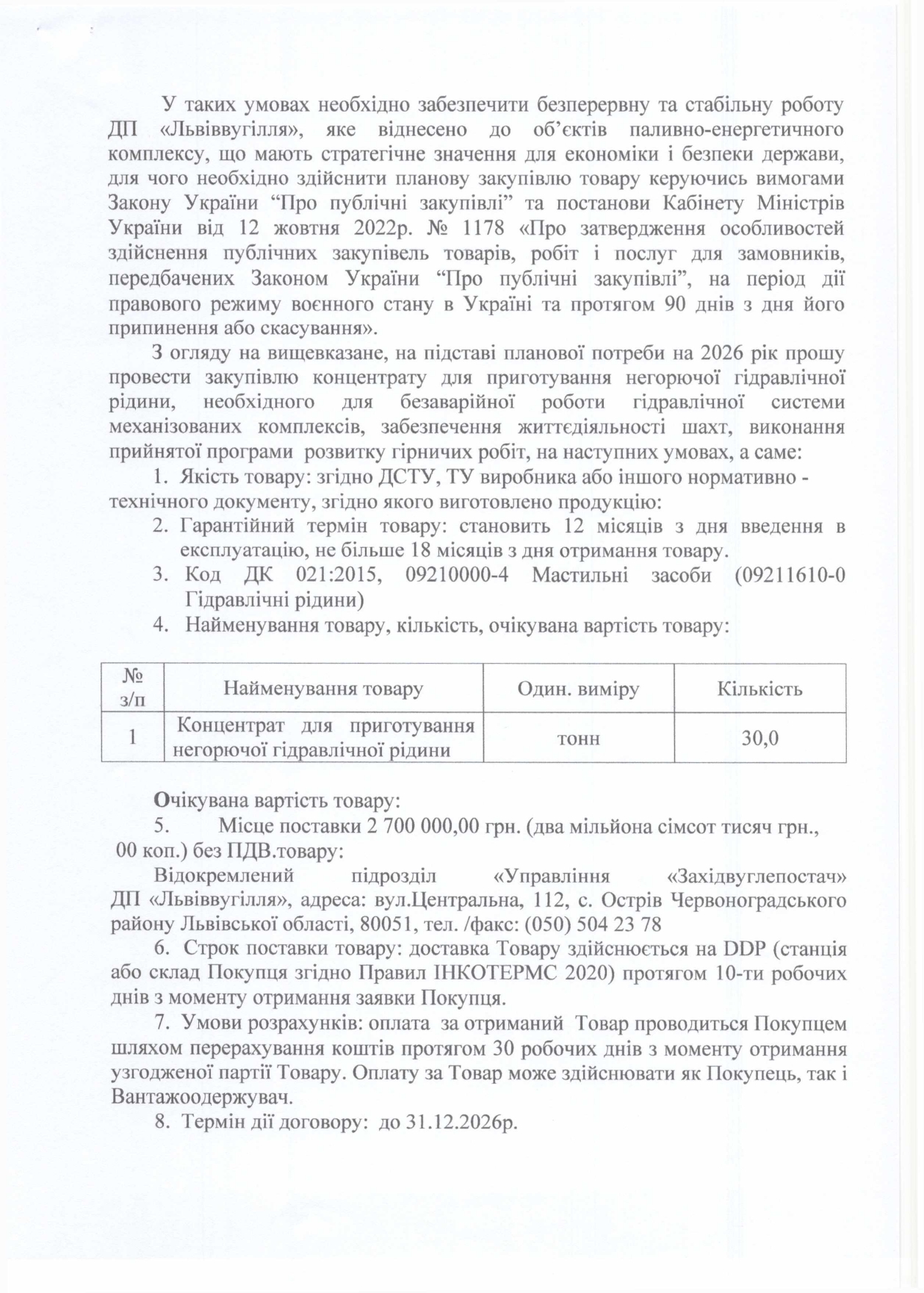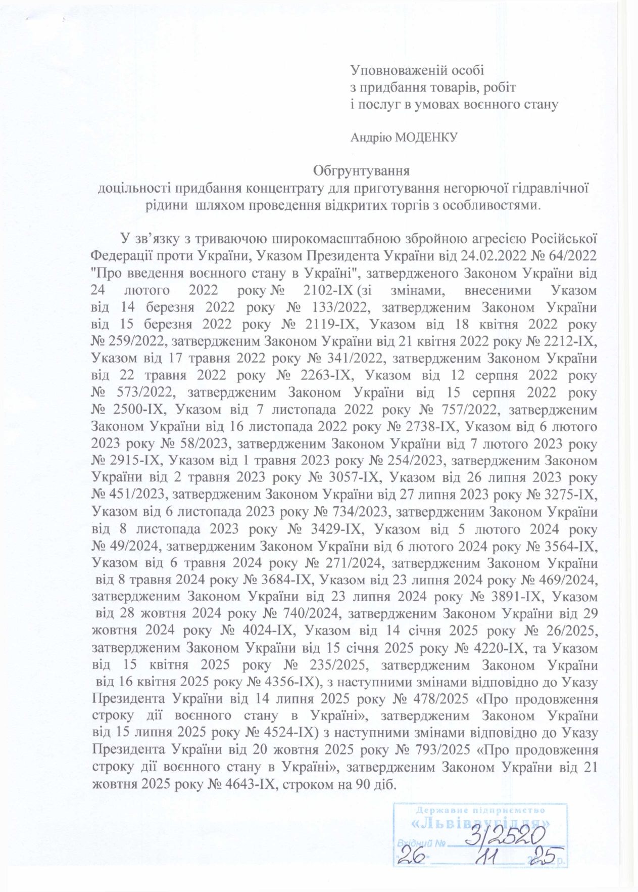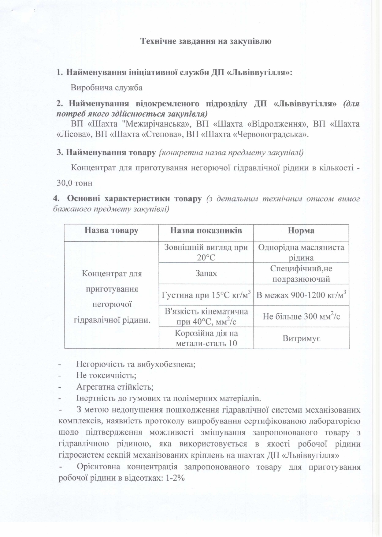 Обгрунтування доцільності закупівлі концентрату для приготування негорючої гідравлічної рідини_page-0001 Обгрунтування доцільності закупівлі концентрату для приготування негорючої гідравлічної рідини_page-0002 Обгрунтування доцільності закупівлі концентрату для приготування негорючої гідравлічної рідини_page-0003Технічне завдання на закупівлю концентрату для приготування негорючої гідравлічної рідини_page-0001 Технічне завдання на закупівлю концентрату для приготування негорючої гідравлічної рідини_page-0002