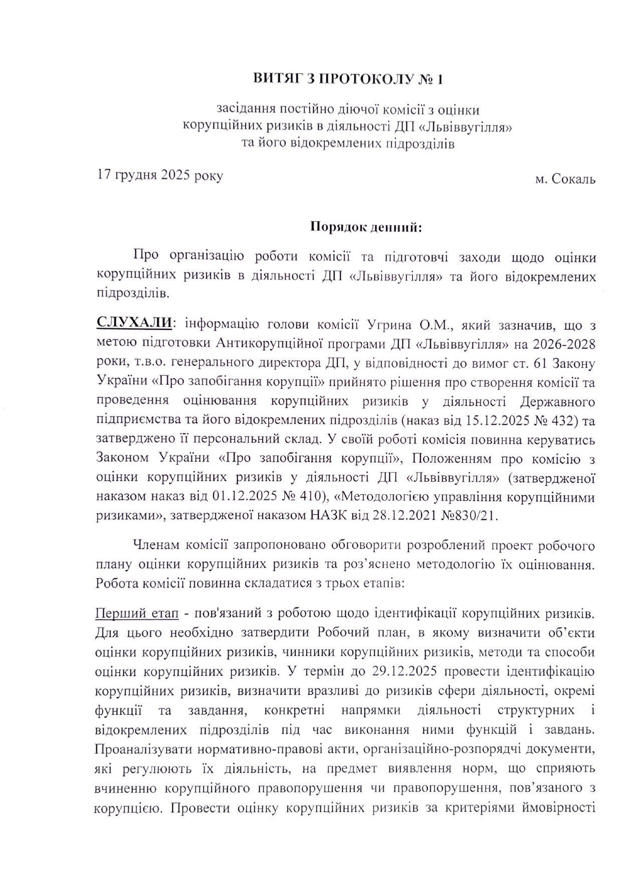 ПРО ОРГАНІЗАЦІЮ РОБОТИ КОМІСІЇ ТА ПІДГОТОВЧІ ЗАХОДИ ЩОДО ОЦІНКИ КОРУПЦІЙНИХ РИЗИКІВ В ДІЯЛЬНОСТІ ДП «ЛЬВІВВУГІЛЛЯ» ТА ЙОГО ВІДОКРЕМЛЕНИХ ПІДРОЗДІЛІВ Опубліковано 18.12.2025
