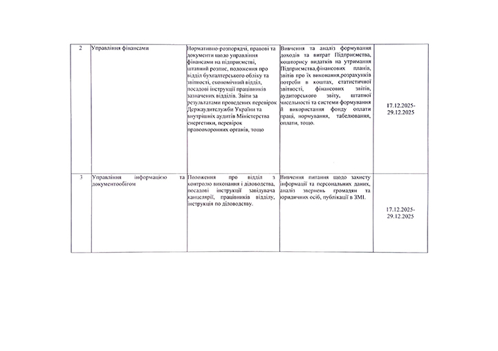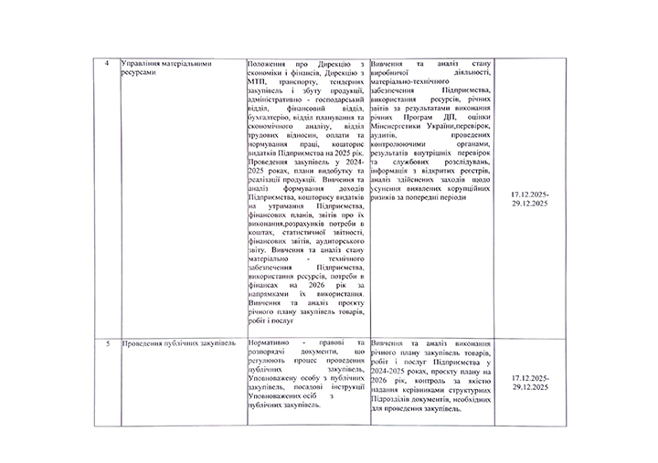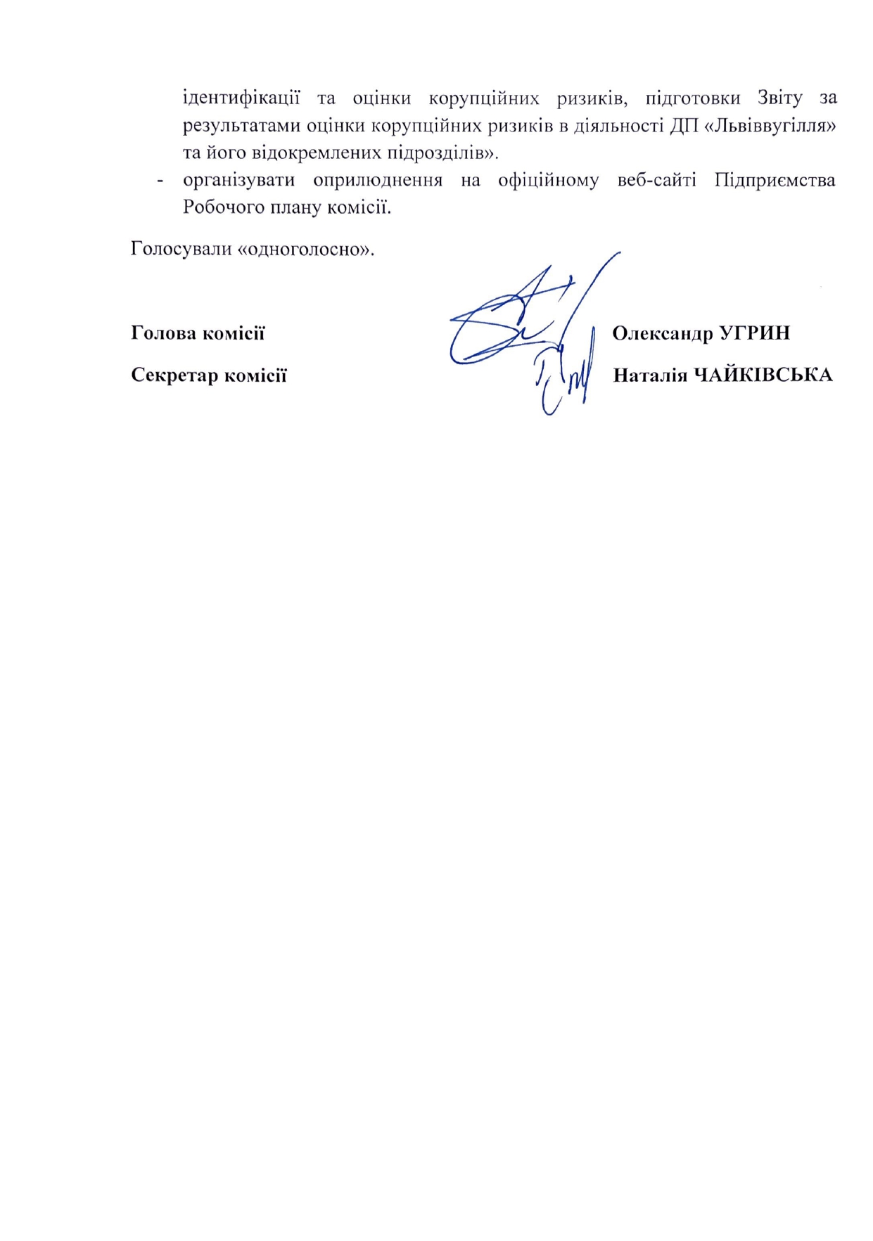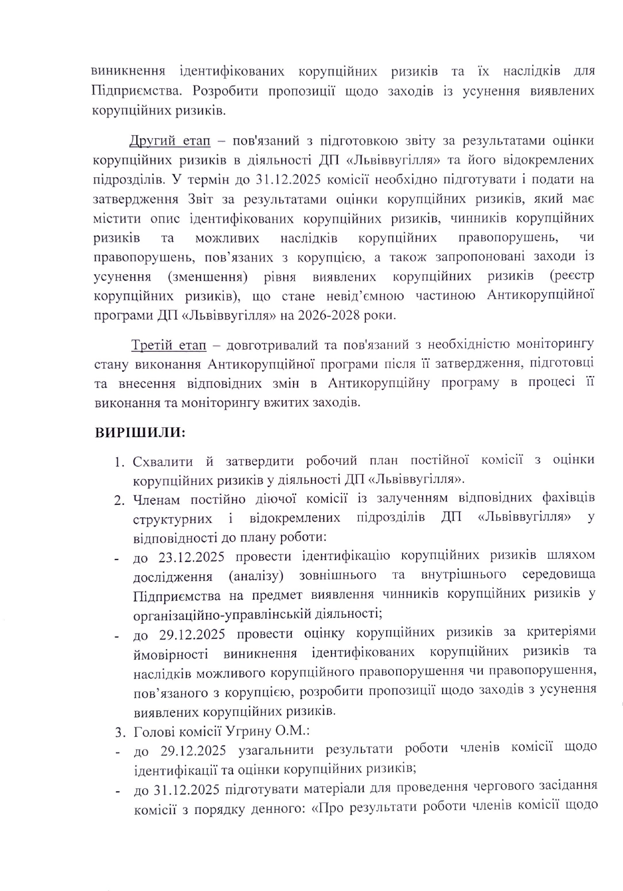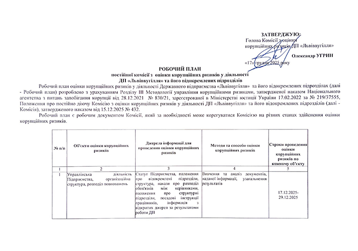 РОБОЧИЙ ПЛАН постійної комісії з оцінки корупційних ризиків у діяльності ДП «Львіввугілля» та його відокремлених підрозділів Опубліковано 18.12.2025