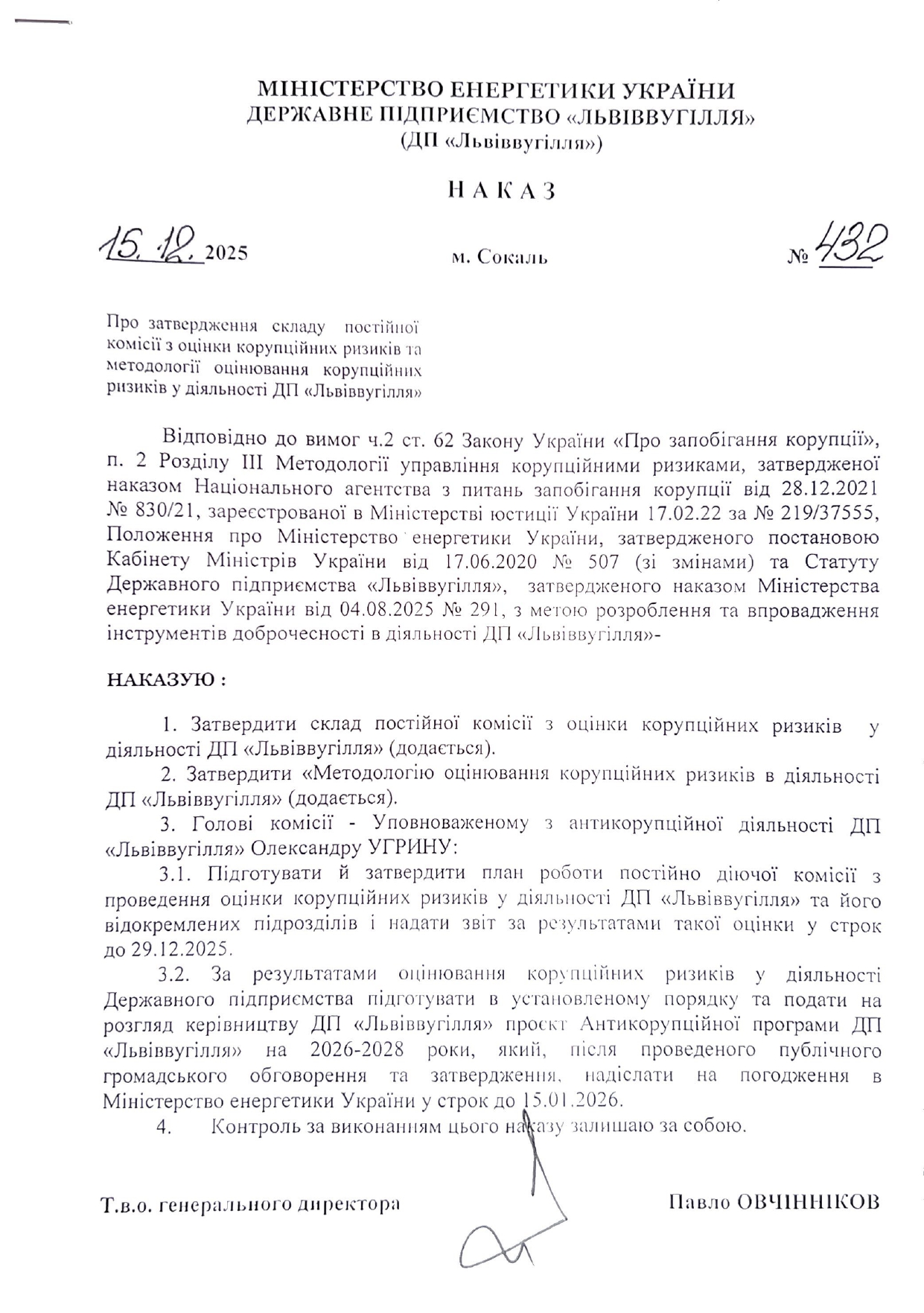 Наказ «Про затвердження складу постійної комісії з оцінки корупційних ризиків та методології оцінювання корупційних ризиків у діяльності ДП «Львіввугілля» Опубліковано 18.12.2025