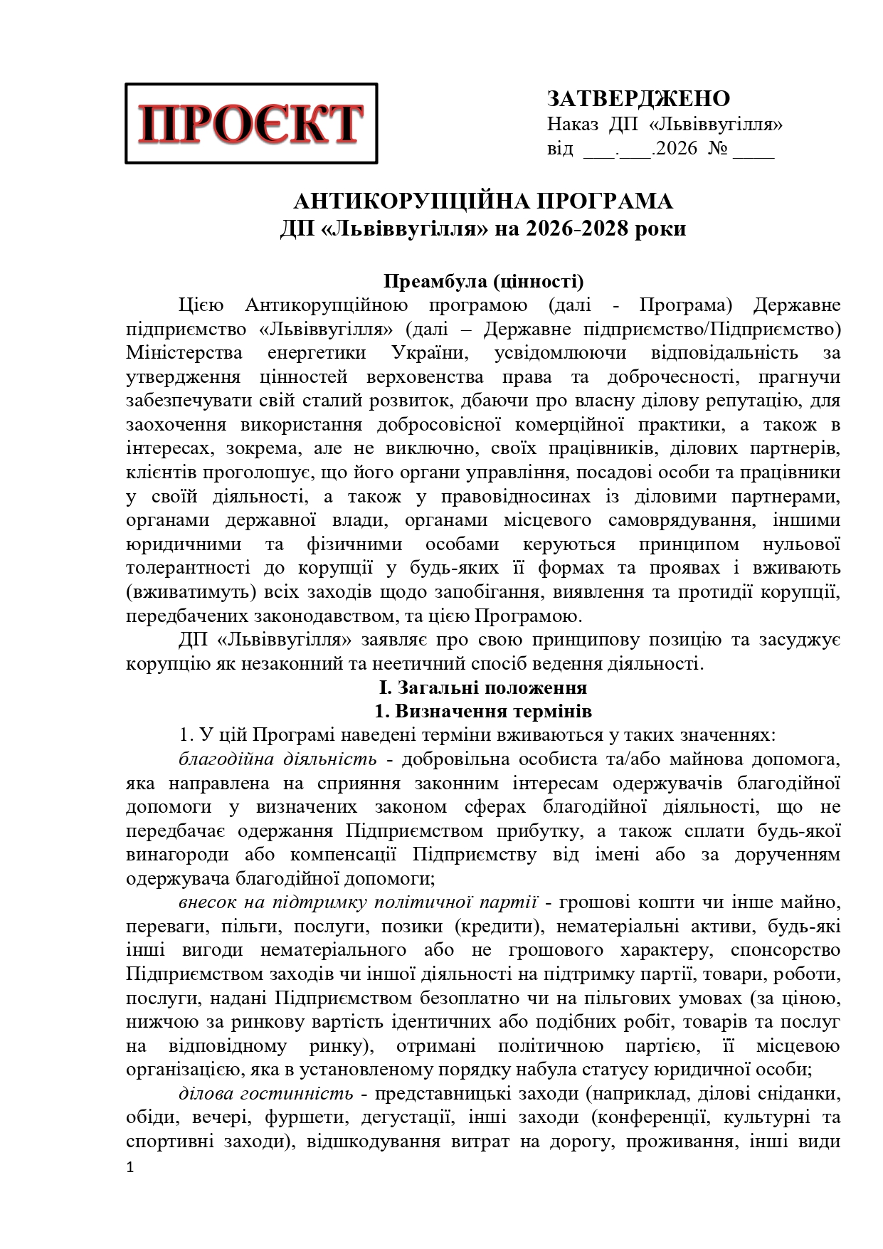 Пропозиції та зауваження до проєкту Антикорупційної програми ДП «Львіввугілля» на 2026-2028 роки можна надати до 12.01.2026 письмово на адресу підприємства (вул. Б.Хмельницького, 26, м. Сокаль, Шептицький район, Львівська область, 80000) чи за допомогою електронної пошти на адресу: lvug@ukr.net.