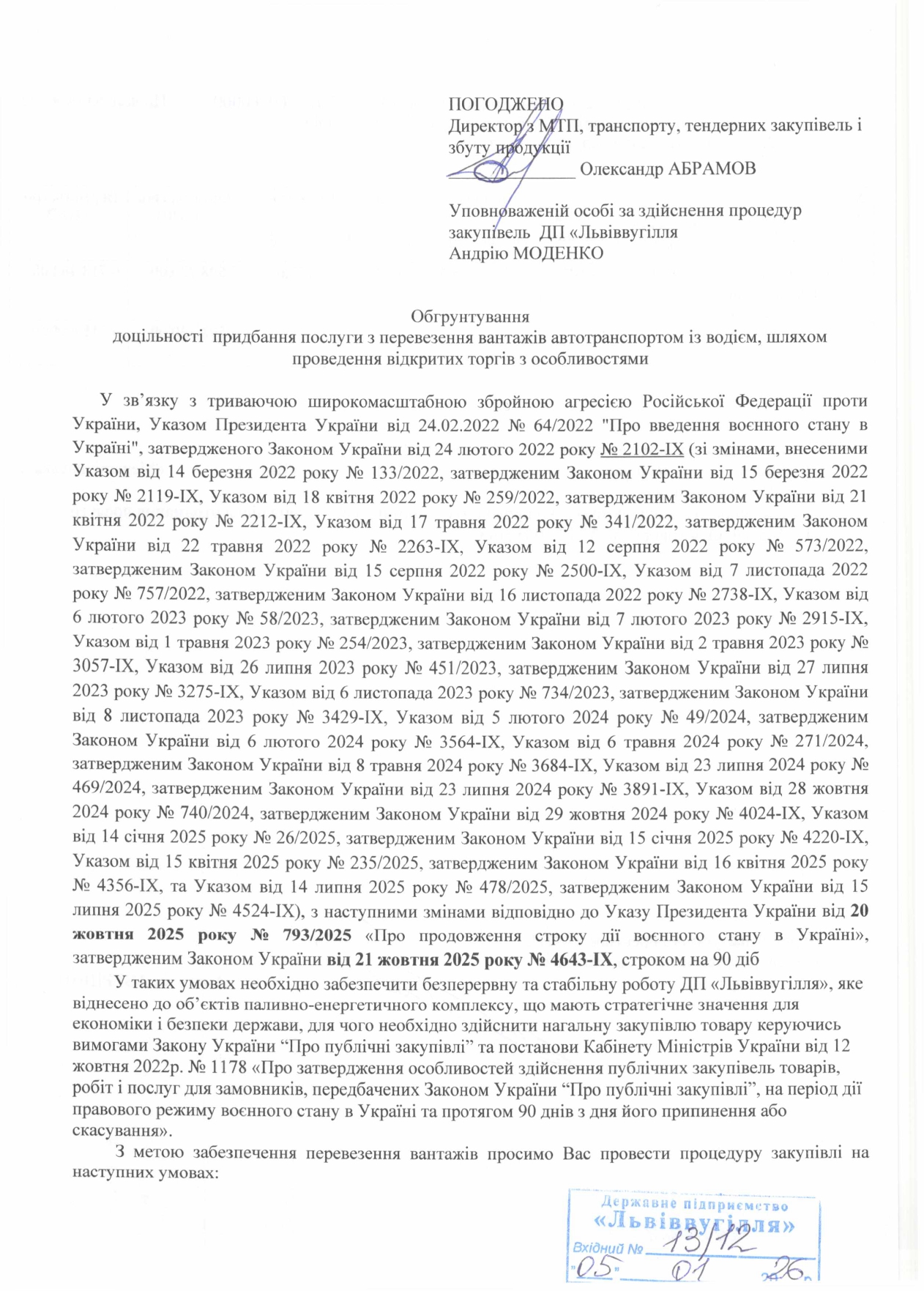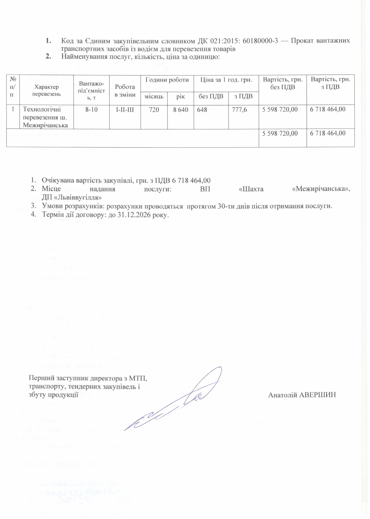 ТЕХНОЛОГІЧНІ ПЕРЕВЕЗЕННЯ ДЛЯ ПОТРЕБ ВП “ШАХТА”"МЕЖИРІЧАНСЬКА” ДП “ЛЬВІВВУГІЛЛЯ”