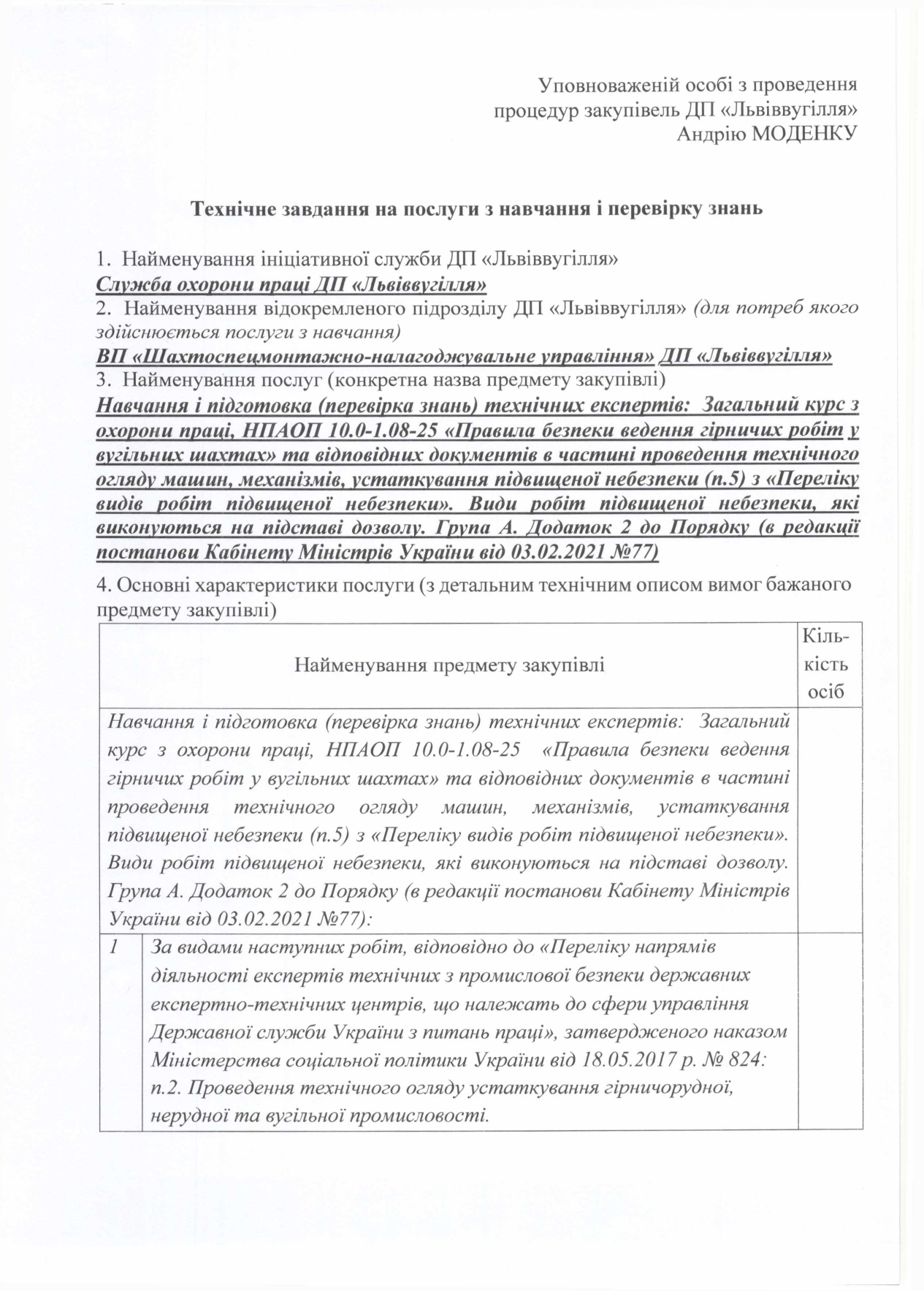 НАВЧАННЯ І ПІДГОТОВКА (ПЕРЕВІРКА ЗНАНЬ) ТЕХНІЧНИХ ЕКСПЕРТІВ: ЗАГАЛЬНИЙ КУРС З ОХОРОНИ ПРАЦІ, НПАОП 10.0-1.01-10 «ПРАВИЛА БЕЗПЕКИ У ВУГІЛЬНИХ ШАХТАХ» ТА ВІДПОВІДНИХ ДОКУМЕНТІВ В ЧАСТИНІ ПРОВЕДЕННЯ ТЕХНІЧНОГО ОГЛЯДУ МАШИН, МЕХАНІЗМІВ, УСТАТКУВАННЯ ПІДВИЩЕНОЇ НЕБЕЗПЕКИ (П.5) З «ПЕРЕЛІКУ ВИДІВ РОБІТ ПІДВИЩЕНОЇ НЕБЕЗПЕКИ». ВИДИ РОБІТ ПІДВИЩЕНОЇ НЕБЕЗПЕКИ, ЯКІ ВИКОНУЮТЬСЯ НА ПІДСТАВІ ДОЗВОЛУ. ГРУПА А. ДОДАТОК 2 ДО ПОРЯДКУ (В РЕДАКЦІЇ ПОСТАНОВИ КАБІНЕТУ МІНІСТРІВ УКРАЇНИ ВІД 03.02.2021 №77)