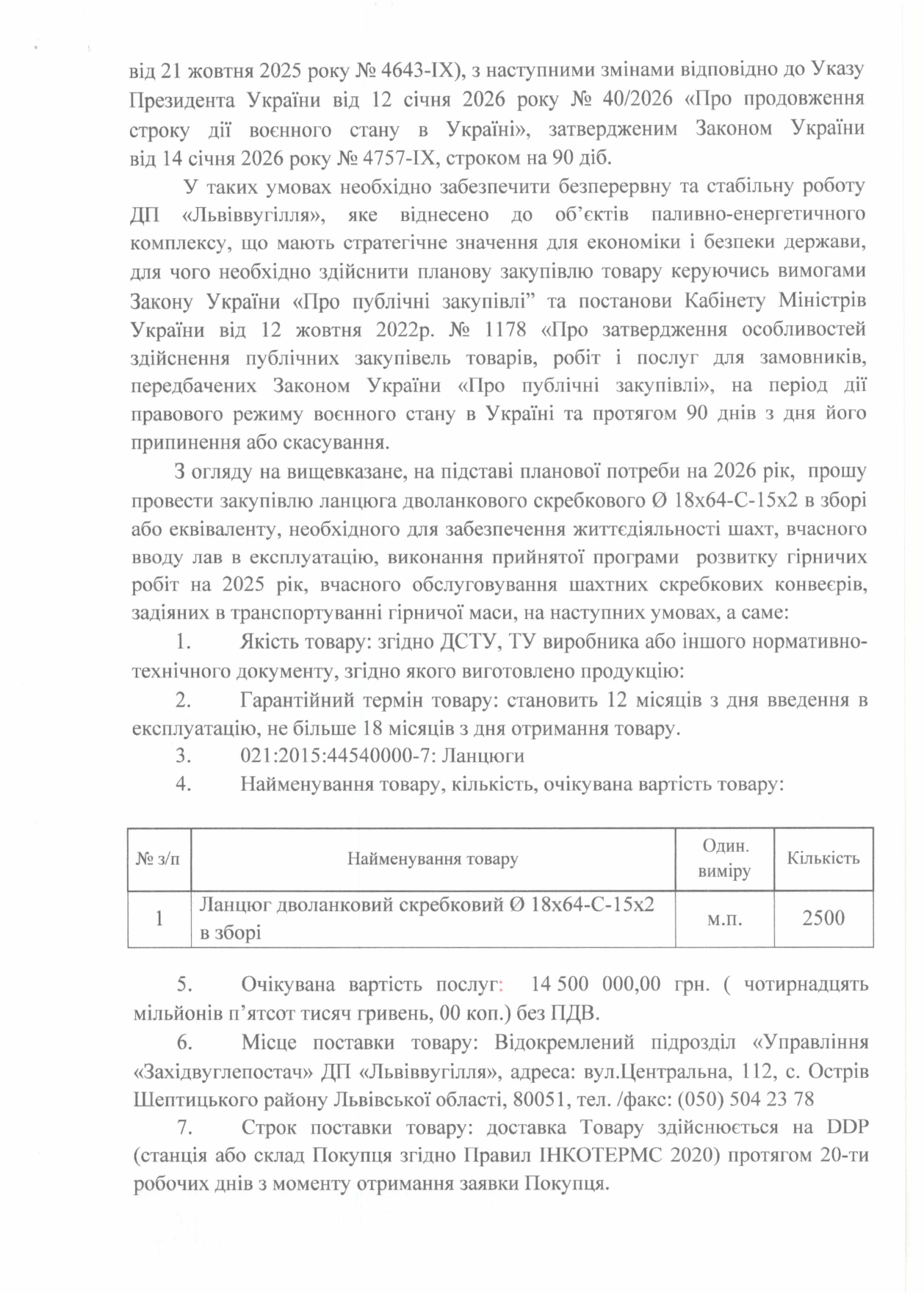 Очікувана вартість:                     14 500 000,00 грн   без ПДВ