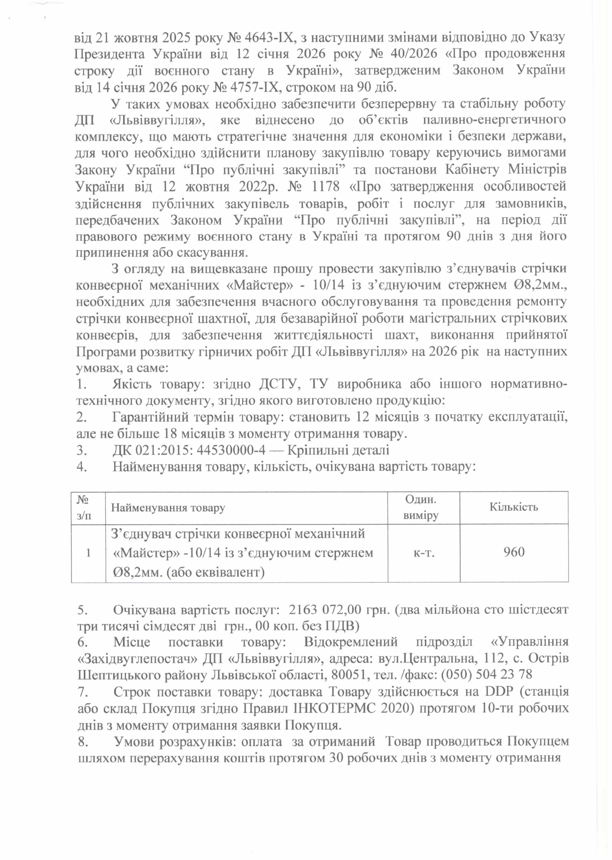 Очікувана вартість:               2 163 072,00 UAHОбгрунтування доцільності закупівлі з'єднувачів стрічки конвеєрної_page-0001 Обгрунтування доцільності закупівлі з'єднувачів стрічки конвеєрної_page-0002 Обгрунтування доцільності закупівлі з'єднувачів стрічки конвеєрної_page-0003Технічне завдання на закупівлю з'єднувачів стрічки конвеєрної_page-0001 Технічне завдання на закупівлю з'єднувачів стрічки конвеєрної_page-0002