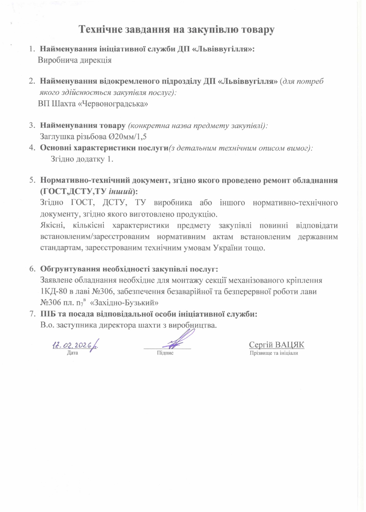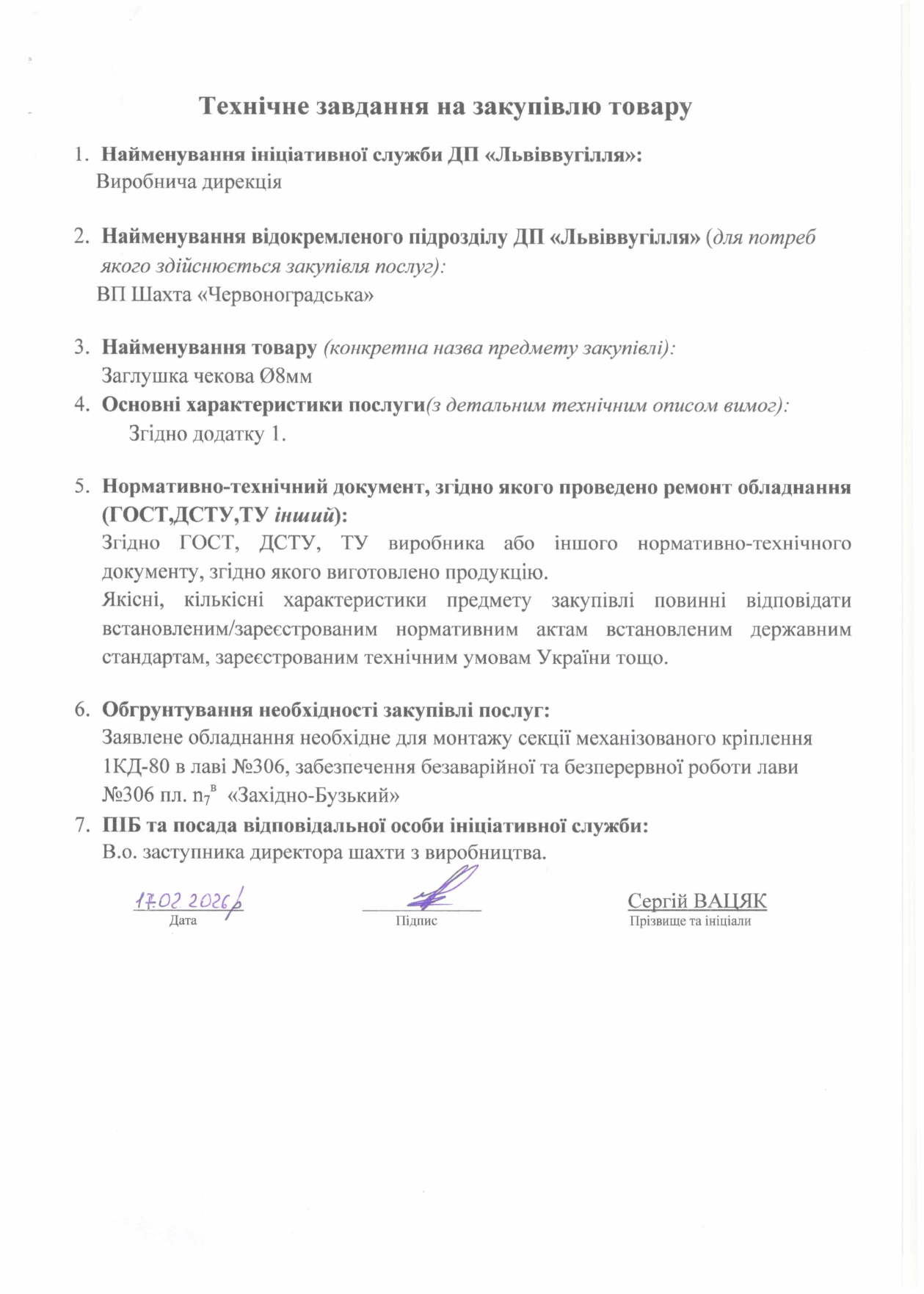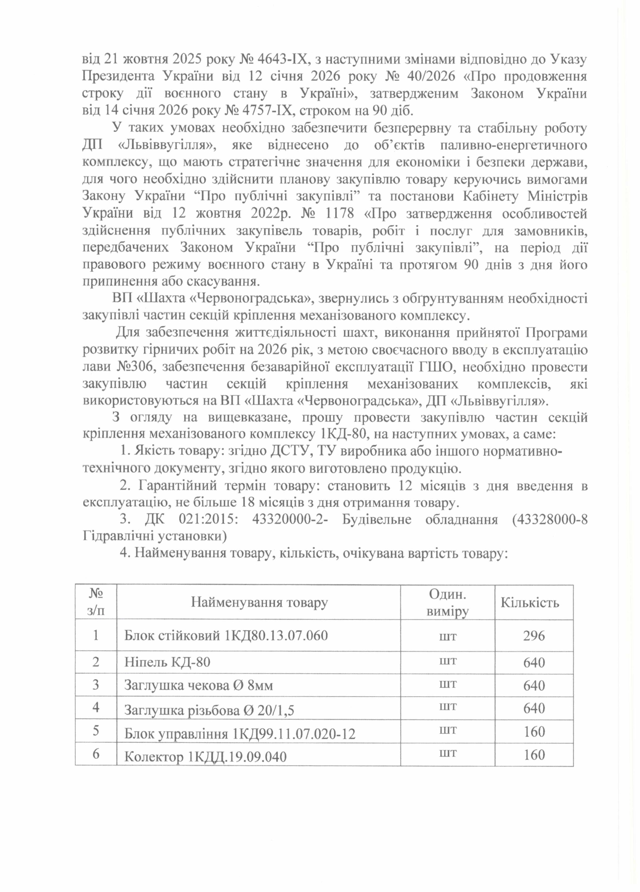 Обгрунтування доцільності закупівлі частин секцій механізованого кріплення 1КД-80 (1)_page-0001 Обгрунтування доцільності закупівлі частин секцій механізованого кріплення 1КД-80 (1)_page-0002 Обгрунтування доцільності закупівлі частин секцій механізованого кріплення 1КД-80 (1)_page-0003Технічне завдання на закупівлю частин секцій механізованого кріплення 1КД-80 (1)_page-0001 Технічне завдання на закупівлю частин секцій механізованого кріплення 1КД-80 (1)_page-0002 Технічне завдання на закупівлю частин секцій механізованого кріплення 1КД-80 (1)_page-0003 Технічне завдання на закупівлю частин секцій механізованого кріплення 1КД-80 (1)_page-0004 Технічне завдання на закупівлю частин секцій механізованого кріплення 1КД-80 (1)_page-0005 Технічне завдання на закупівлю частин секцій механізованого кріплення 1КД-80 (1)_page-0006 Технічне завдання на закупівлю частин секцій механізованого кріплення 1КД-80 (1)_page-0007 Технічне завдання на закупівлю частин секцій механізованого кріплення 1КД-80 (1)_page-0008 Технічне завдання на закупівлю частин секцій механізованого кріплення 1КД-80 (1)_page-0009 Технічне завдання на закупівлю частин секцій механізованого кріплення 1КД-80 (1)_page-0010 Технічне завдання на закупівлю частин секцій механізованого кріплення 1КД-80 (1)_page-0011 Технічне завдання на закупівлю частин секцій механізованого кріплення 1КД-80 (1)_page-0012